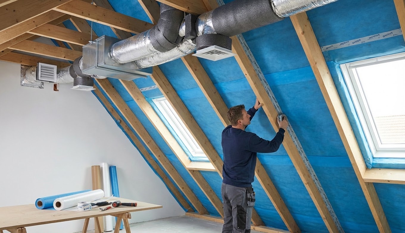 Installer un pare-vapeur empêche la formation de condensation excessive sous la toiture. Cet élément bloque, en d’autres termes, l’humidité venant de l’intérieur vers l’isolant. Chaque raccord doit être soigneusement scellé pour préserver l’étanchéité le long des chevrons. Le spécialiste vérifie, par conséquent, la compatibilité entre le pare-vapeur et la ventilation existante. Cette combinaison assure un flux d’air sain et réduit durablement tout risque de moisissure.