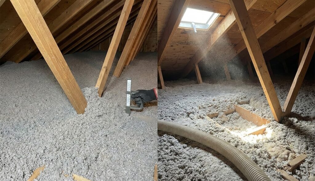La pose en vrac ou soufflage dans les combles perdus exige une densité précise pour limiter le tassement. Lorsque cette densité n’est pas respectée, l’isolant autour des fermettes se tasse de manière plus visible que dans les zones ouvertes. Cela crée des insuffisances thermiques qui sont délicates à corriger.