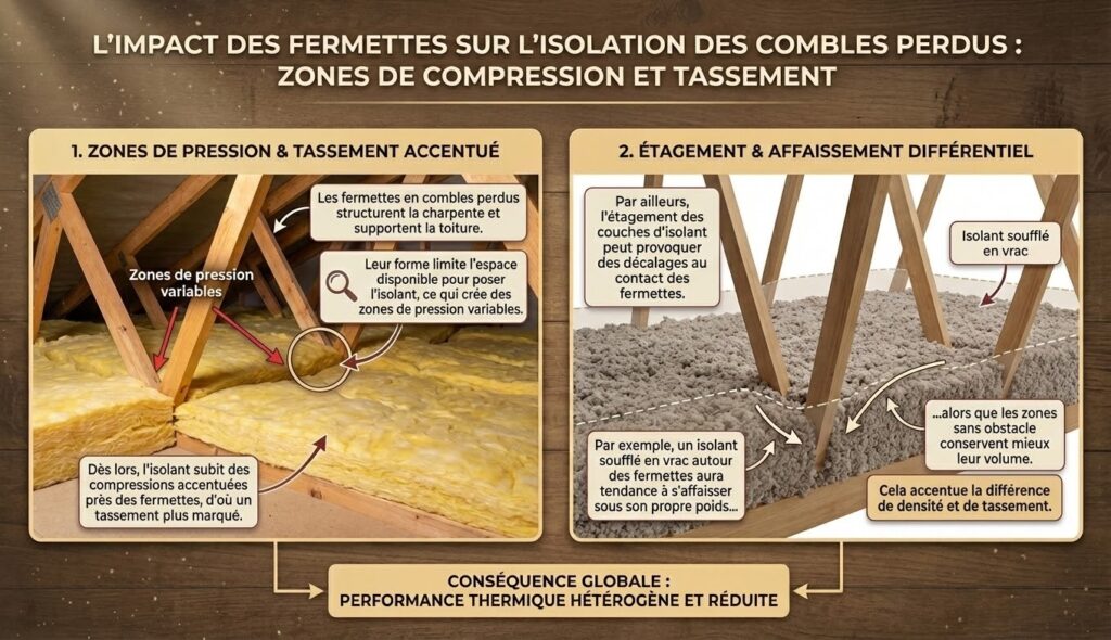 Les fermettes en combles perdus structurent la charpente et supportent la toiture. Leur forme limite l’espace disponible pour poser l’isolant, ce qui crée des zones de pression variables. Dès lors, l’isolant subit des compressions accentuées près des fermettes, d’où un tassement plus marqué.